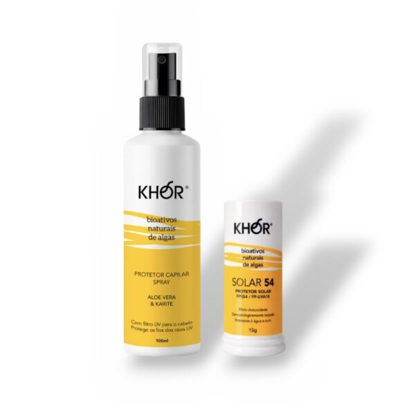 O Duo de Proteção Solar KHOR combina proteção completa para pele e cabelos em um único kit: o Protetor Solar em Bastão FPS 54 e o Protetor Solar Capilar com filtro UV.