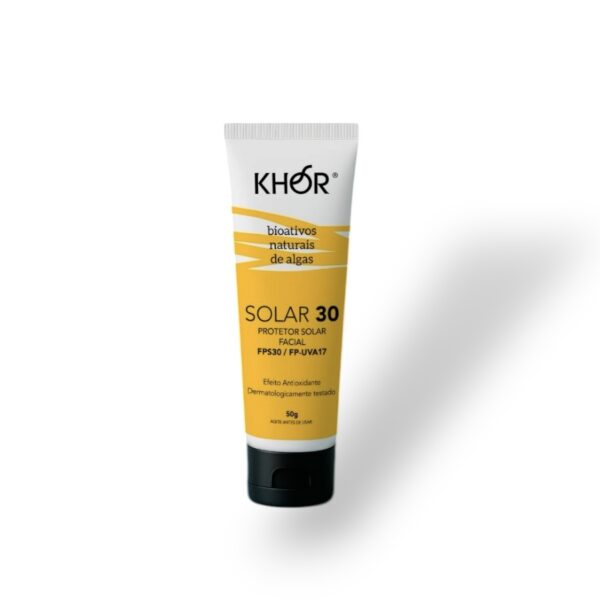 O Protetor Solar Facial FPS 30 KHOR apresenta textura cremosa e é um produto com absorção rápida, toque seco e residual branco reduzido.